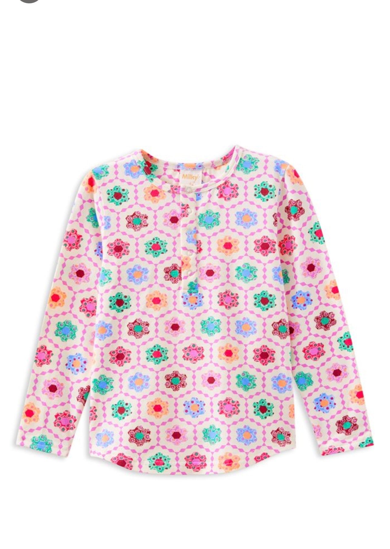 Milky Clothing Honeycomb Bloom Henley. Stay warm this winter in style with the Milky Clothing Henley! This cozy and durable jersey henley features a stylish center front button opening, combining functionality with flair. Available in a variety of colors and fabrics, it makes everyday dressing easy and effortless.
