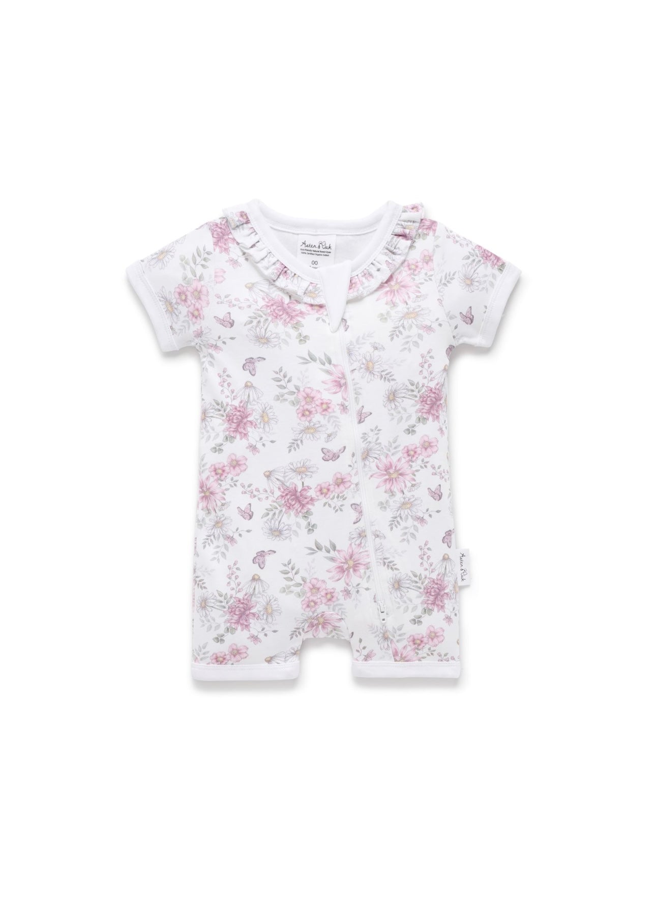 Made from GOTS certified organic cotton, this short sleeved zip romper has a frill to the neckline, features a hand illustrated all over floral print andpremium YKKtwo way zipper with protective backing. 100% Certified organic cotton #USB008294. Made in India. Wash according to care instructions.