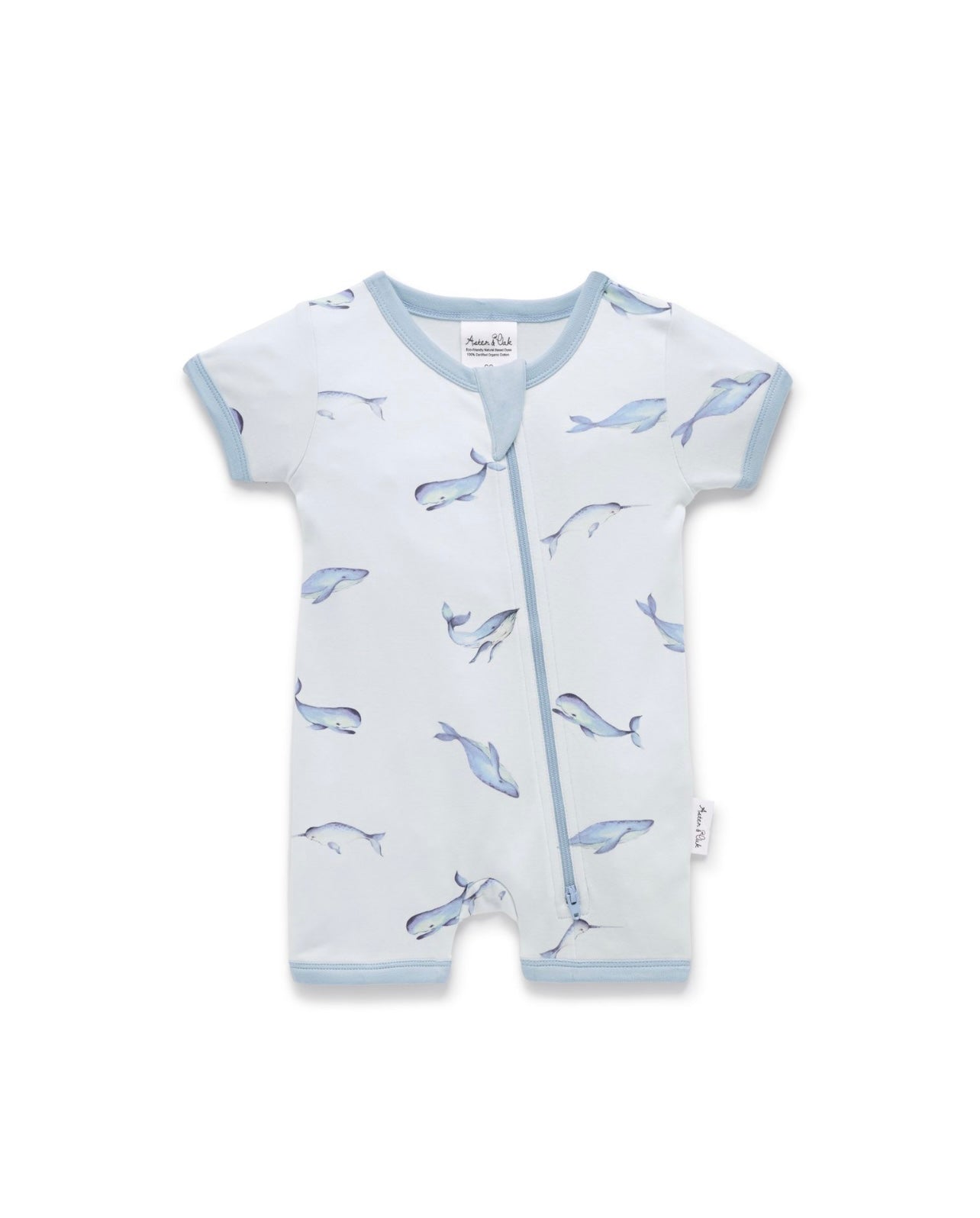 Made with GOTS certified organic cotton, these zip rompers feature an all over hand illustrated whale print, contrsating hemline and premium YKK two way zipper with protective backing. 100% Certified organic cotton #USB008294. Made in India. Wash according to care instructions.