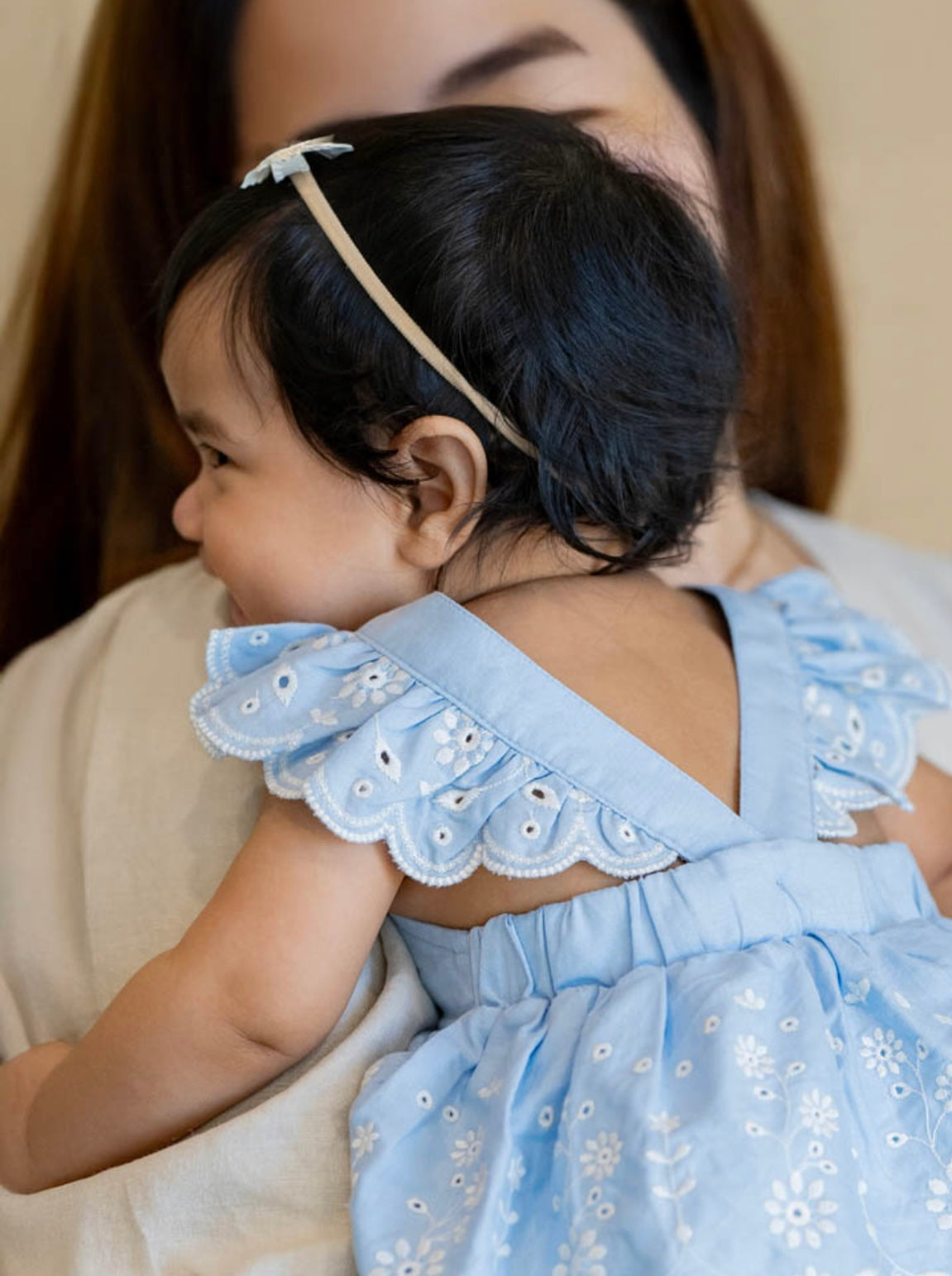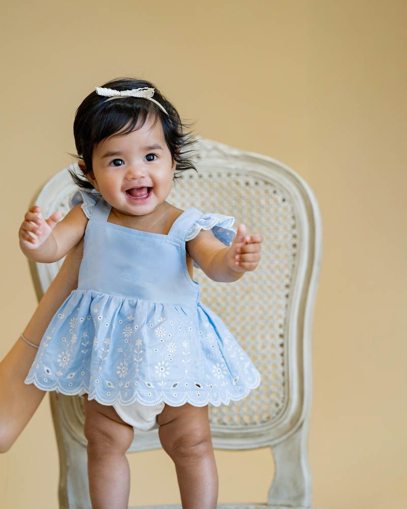 A little outfit made for memory-making days. With sweet scalloped embroidery and delicate shoulder frills, this sky-blue overlay dress romper is a picture of classic charm and playtime comfort. Whether it's a picnic in the park or a family celebration, your little one will look oh-so-lovely.